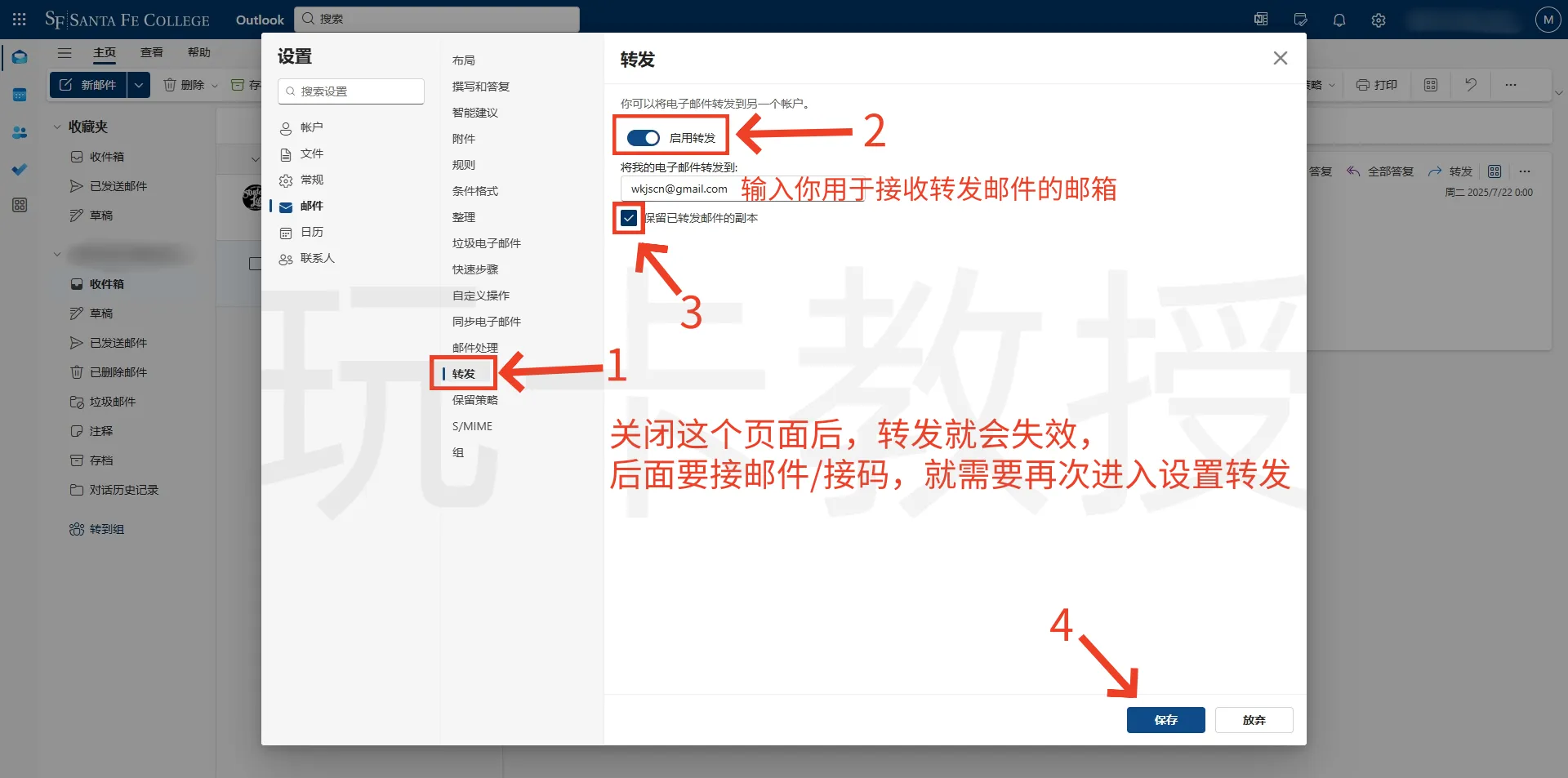 点击转发,启动转发,输入你用于接收转发的邮箱邮件(建议海外邮箱),勾选保留已转发邮件的副本,点击保存