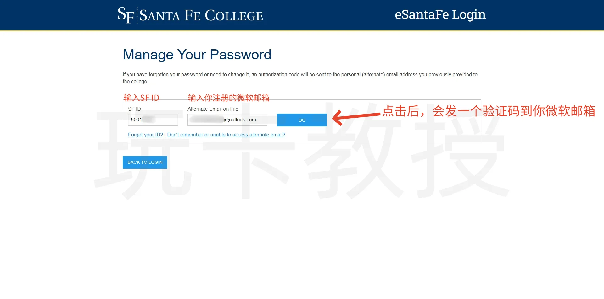 输入SF ID,接着输入你申请教育时候用到的outlook邮箱(微软邮箱),点击GO,会发一个验证码到你outlook邮箱