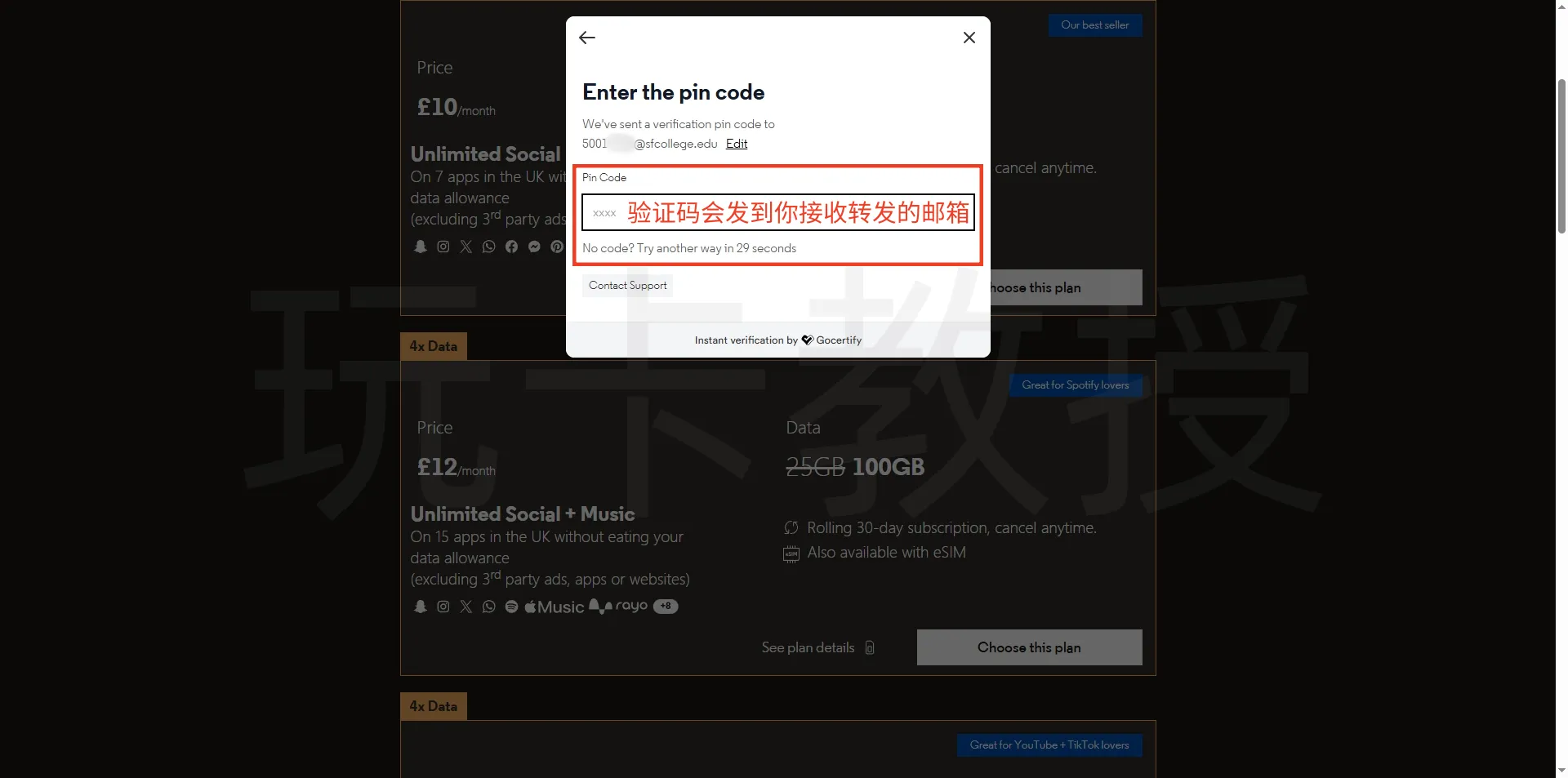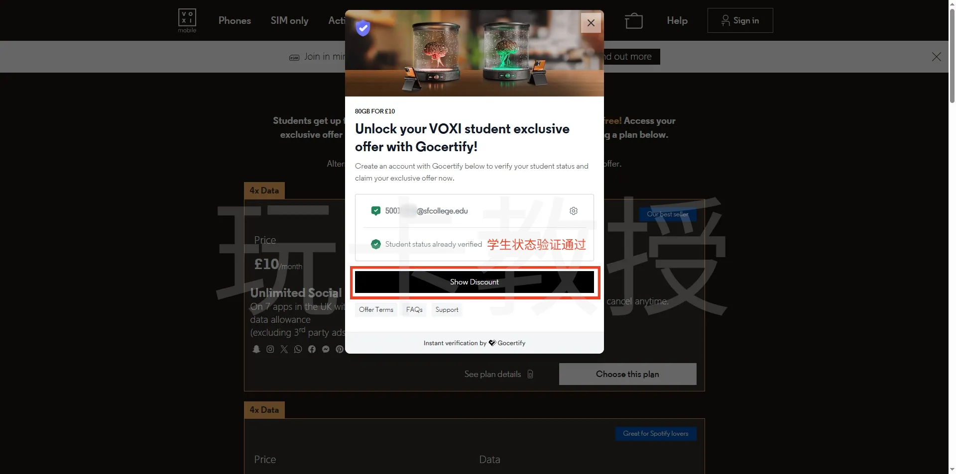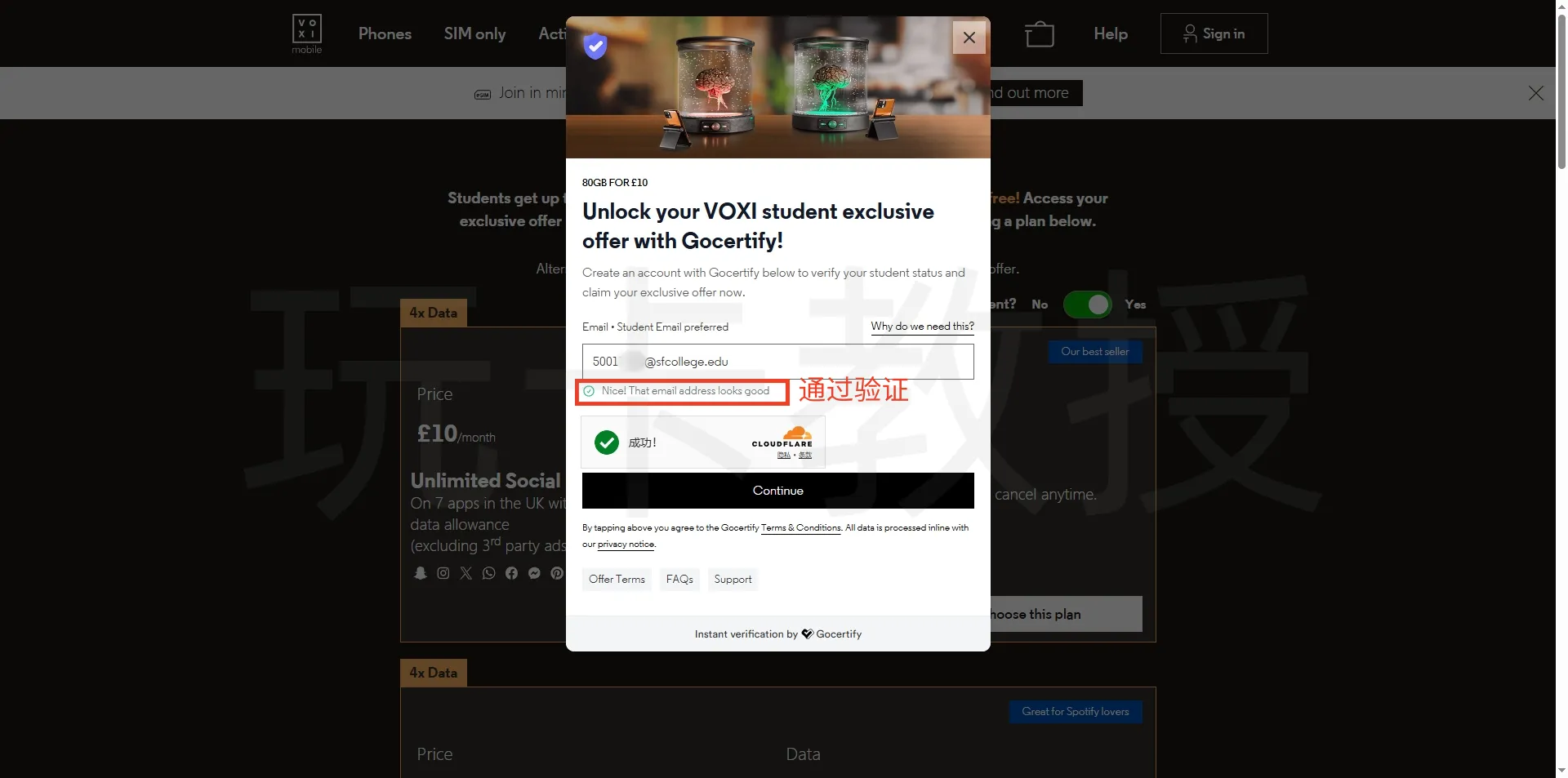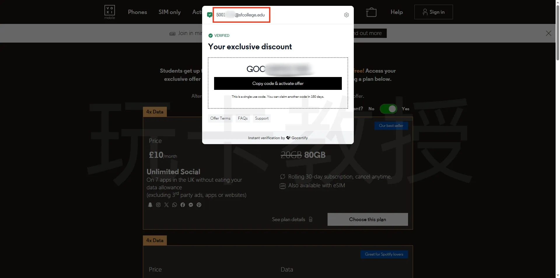 接下来我们测试用这个教育邮箱领取英国Voxi eSIM的教育优惠码,输入邮箱后提示验证通过