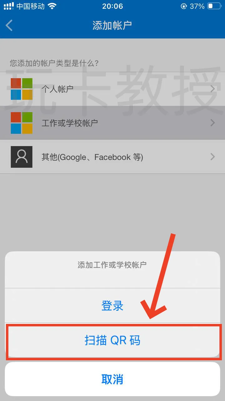 打开Microsoft Authenticator,点击右上角+,选择工作或学校账户,选择扫描QR码