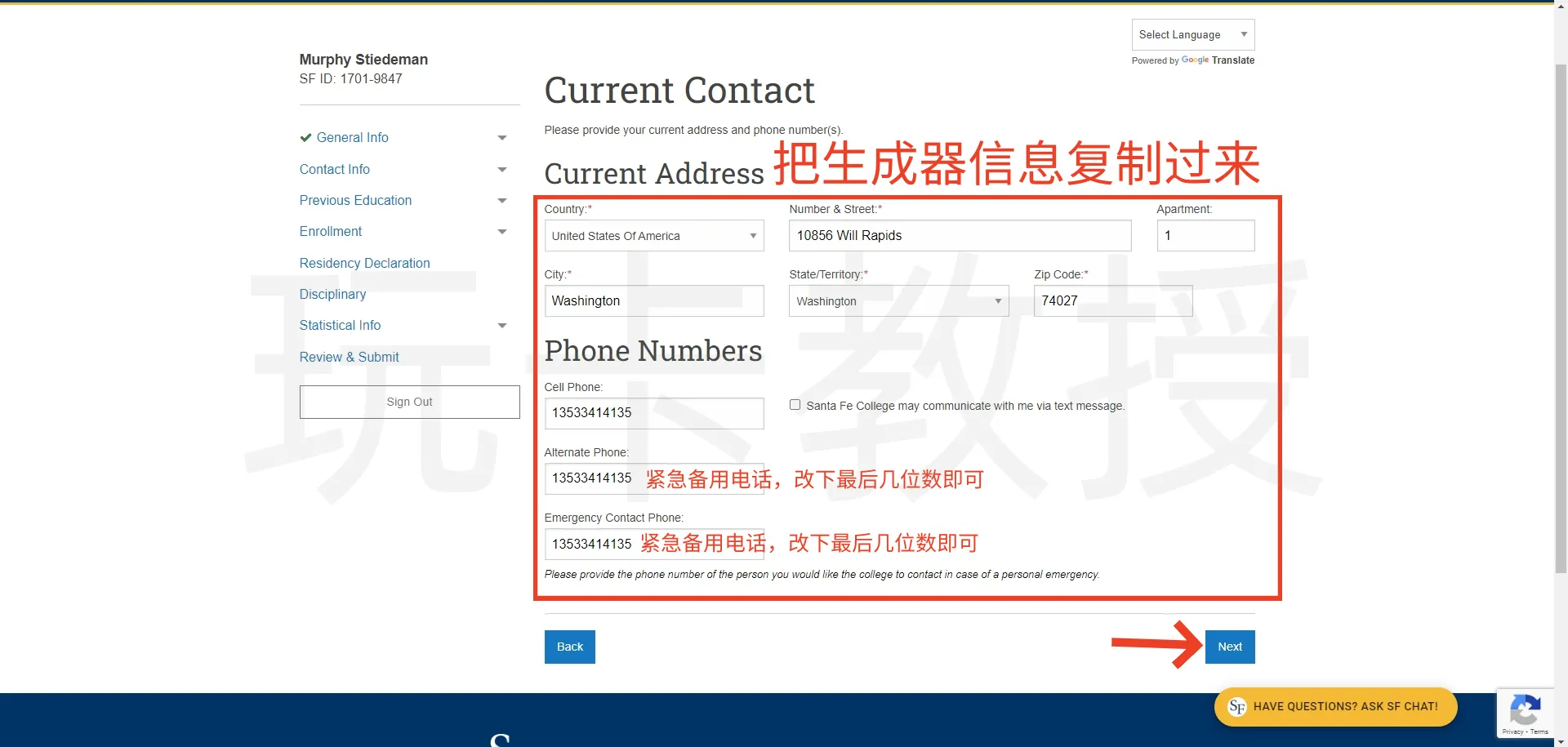 把生成的地址信息复制过来,紧急备用电话改下后几位数即可,点击Next