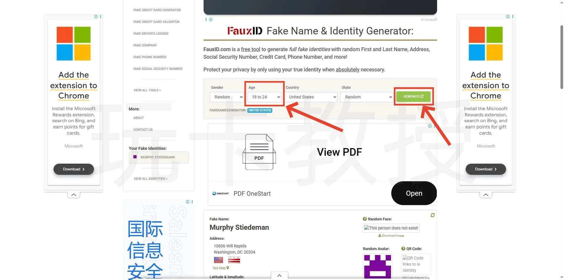 首先我们IP切到美国,打开: https://fauxid.com/ ,生成一个美国个人信息,年龄18-24岁,国家:美国,点击:Generate