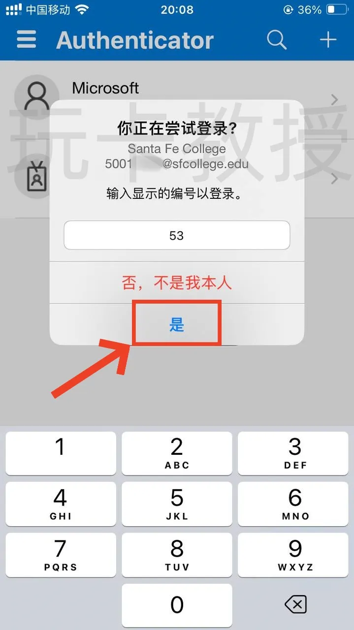 这个时候Microsoft Authenticator,会弹框提示有人尝试登录,我们输入页面显示的53,点击是