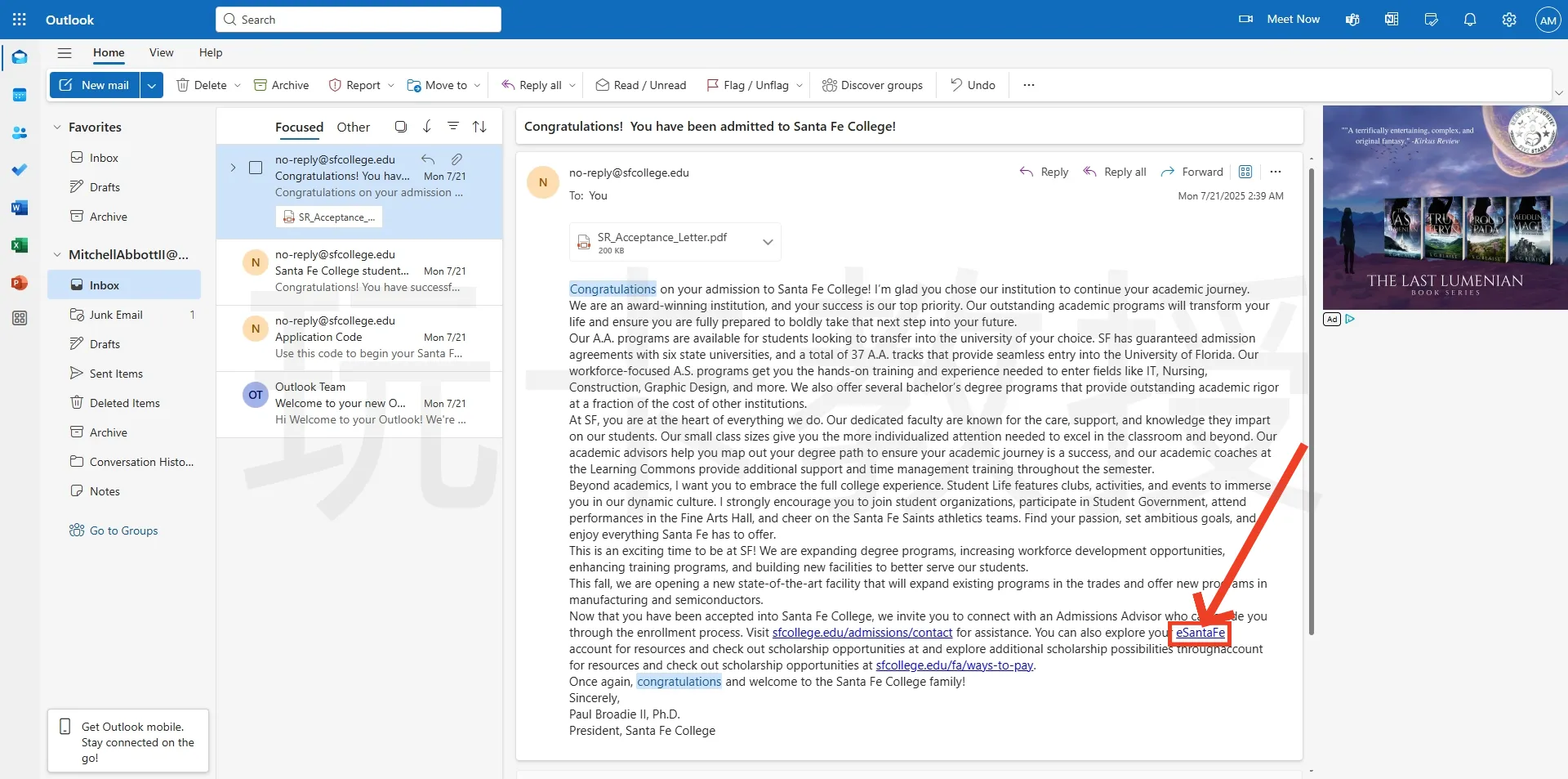 这个时候我们outlook邮箱(微软邮箱)就会录取通知邮件,等待1-3天后,我们点击邮件中的eSantafe,查看是否通过