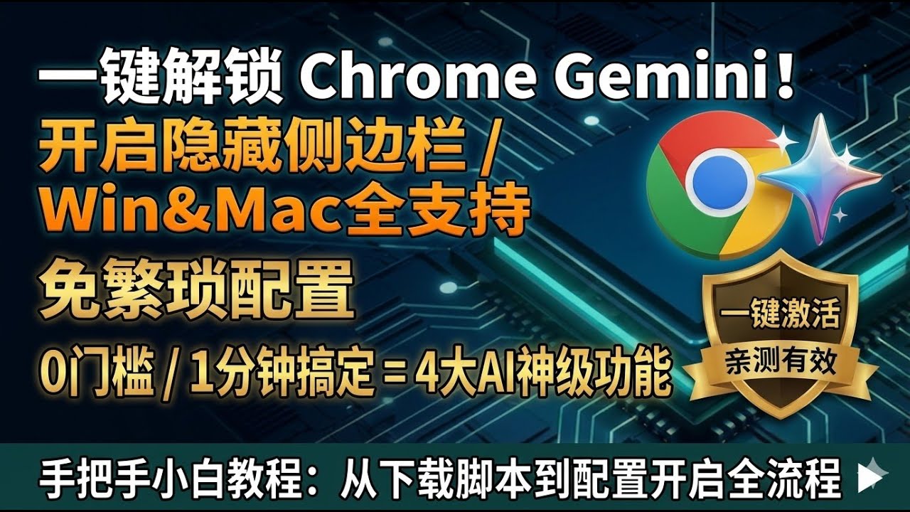 🚀 一键让你的 Chrome 浏览器进化! 还在等谷歌缓慢推送 Gemini 侧边栏功能吗?今天给大家带来一款开源的「Chrome Gemini AI 一键解锁工具」,无论你是 Windows 还是 Mac 用户,只需 1 分钟即可强制开启 Chrome 隐藏的强大 AI 功能!