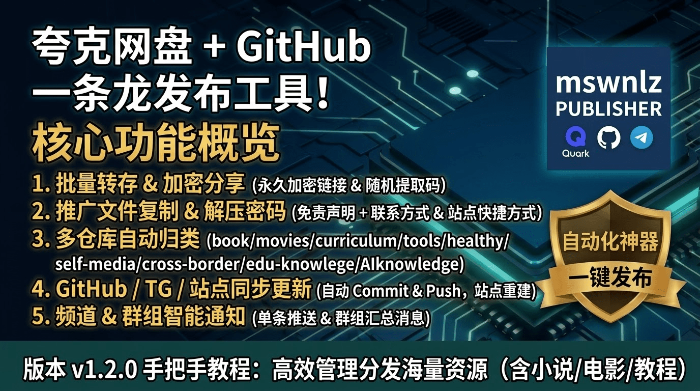 #夸克网盘 #自动化发布 #GitHub #Telegram通知 #资源运营 #批量转存 #永久分享链接 #推广文件 #解压密码 #自动化工具 #Python #Skills #Mswnlz #Doc869hrUk #一条龙发布 #副业兼职 #兼职项目 #夸克赚钱 #小说资源 #电影资源 #教程资源